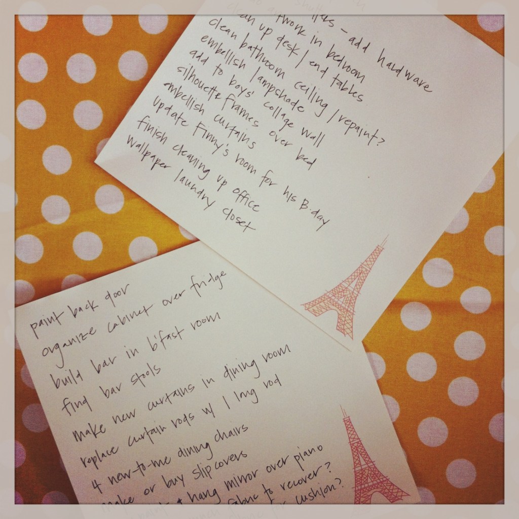 Every season, I make an around the house to-do list of all the projects I want to tackle. These projects range from hanging a new light fixture to framing artwork to painting the porch floor. There seems to be something about a change in the weather that inspires me to get busy being productive and creative. A few days ago, this season’s inspiration struck and the result is the following, ever ambitious, list.