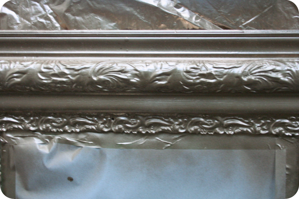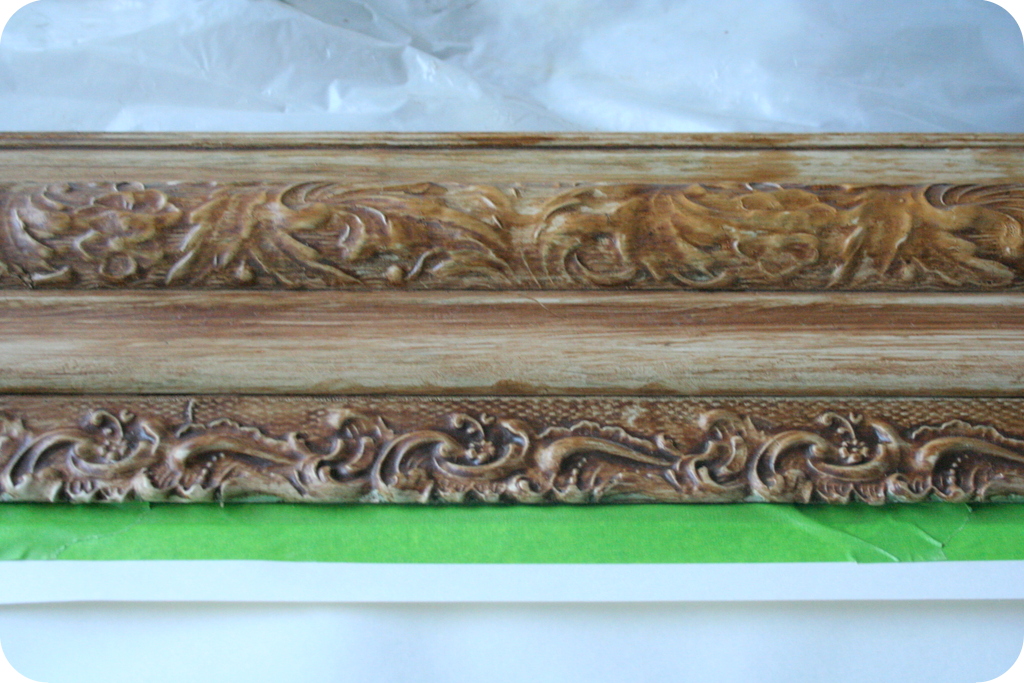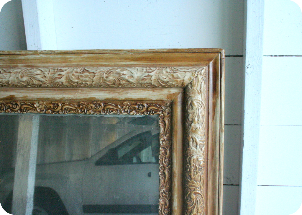 It had an odd, faux wood, 1960s sort of brushed-on finish, but I thought the detailing of the frame had potential. The aging glass was a bit cloudy and unclear, but that didn’t really bother me. A quick inspection of the back of the mirror proved that the glass could easily be replaced if desired.