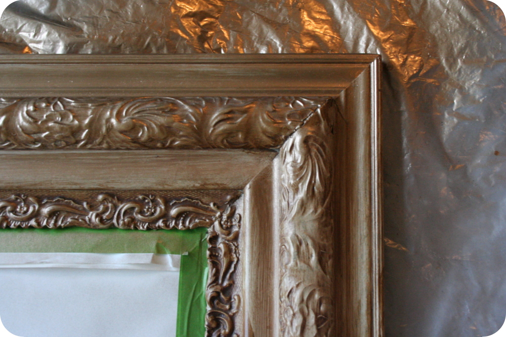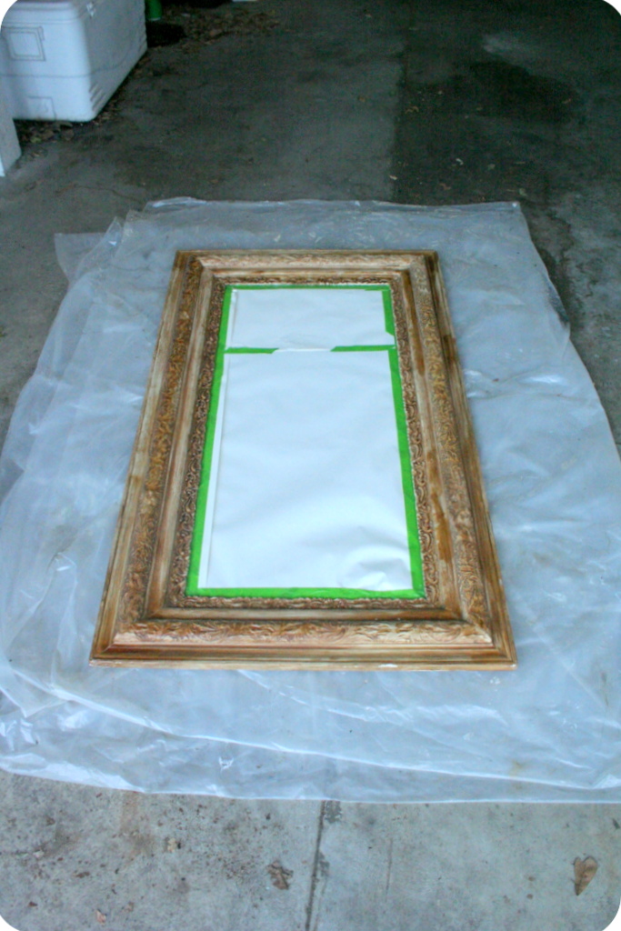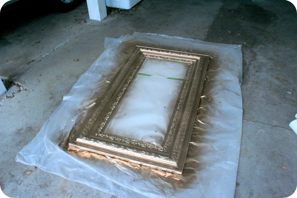 So, I brought the mirror home and stuck it in my storeroom where it sat for about two years until I passed a $5 can of gold spray paint at Lowe’s and inspiration struck. Now for the how to: