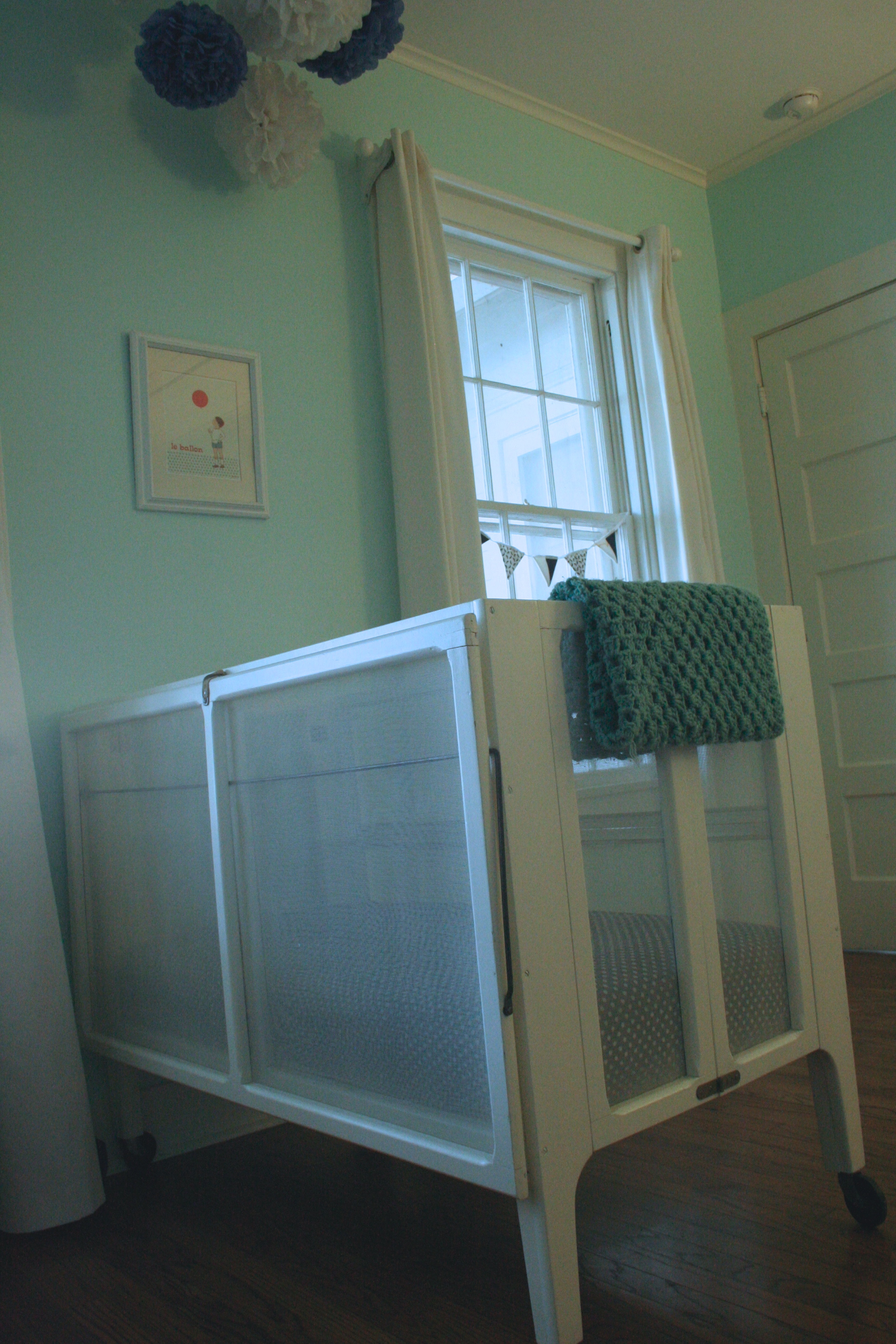 This side latches and folds down making it easy for adults to get baby in and out of the bed, but nearly impossible for a toddler to unlatch both ends at the same time. Yes, that is screen between the wood frame.
