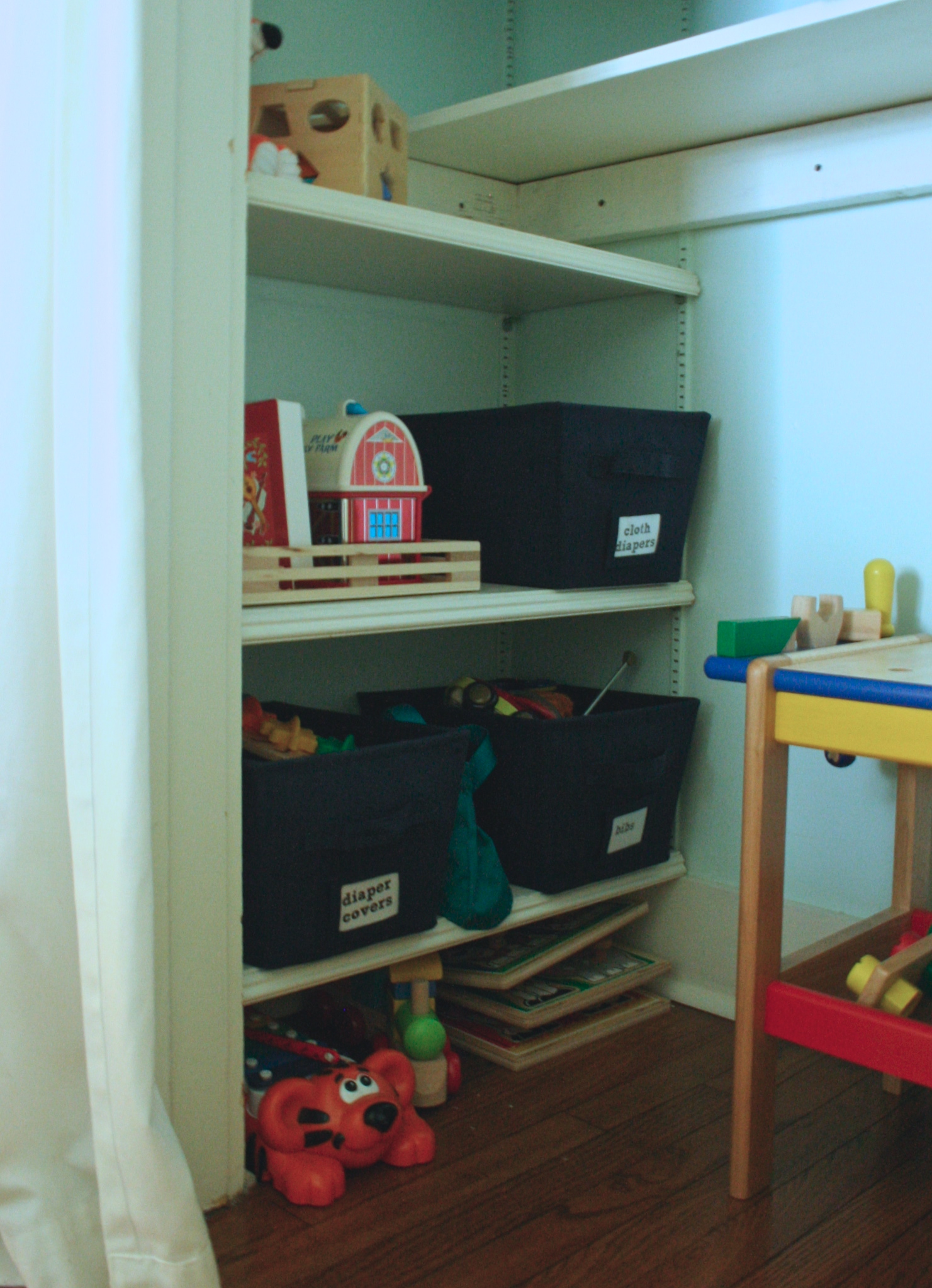 I lowered the adjustable shelves are repurposed baskets (oops! forgot to re-label) to make room for toys.