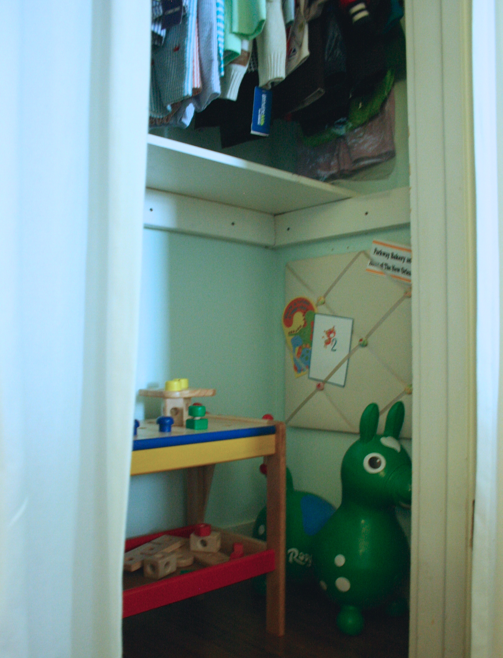 The center and right sides of the closet store larger toys that I’d rather not have displayed in the room. He can actually play with his tools inside the closet!