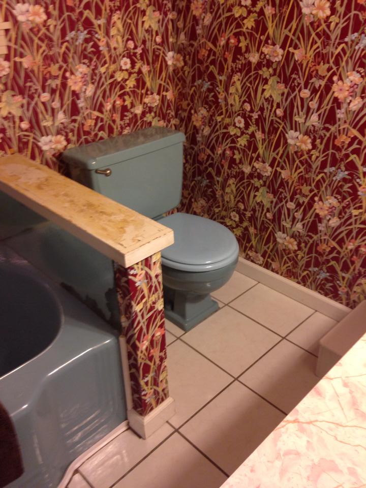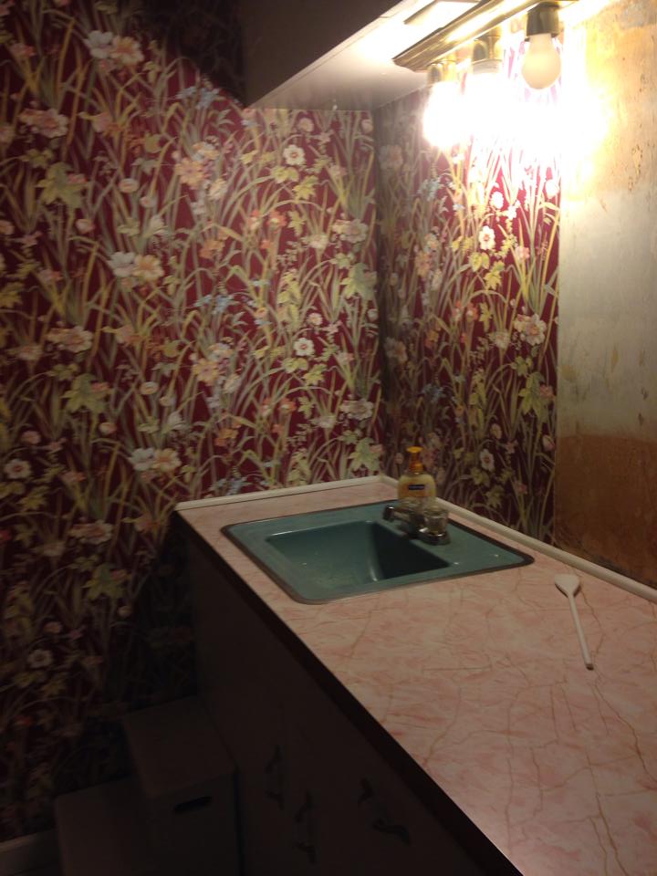 Today we are so very excited to bring you the story of our first design consult job! Heather contacted us a couple months back, asking if we would be interested in helping her with the design of her upcoming bathroom remodel. It was rather surreal, as our dream of consulting was finally being realized. We headed on over to see what we were working with and…holy wallpaper!!!