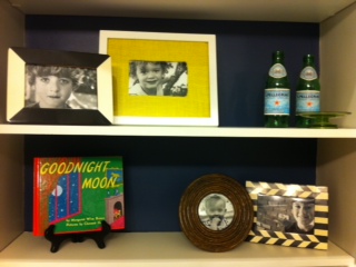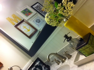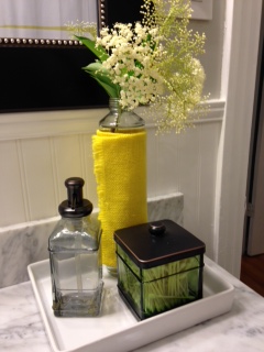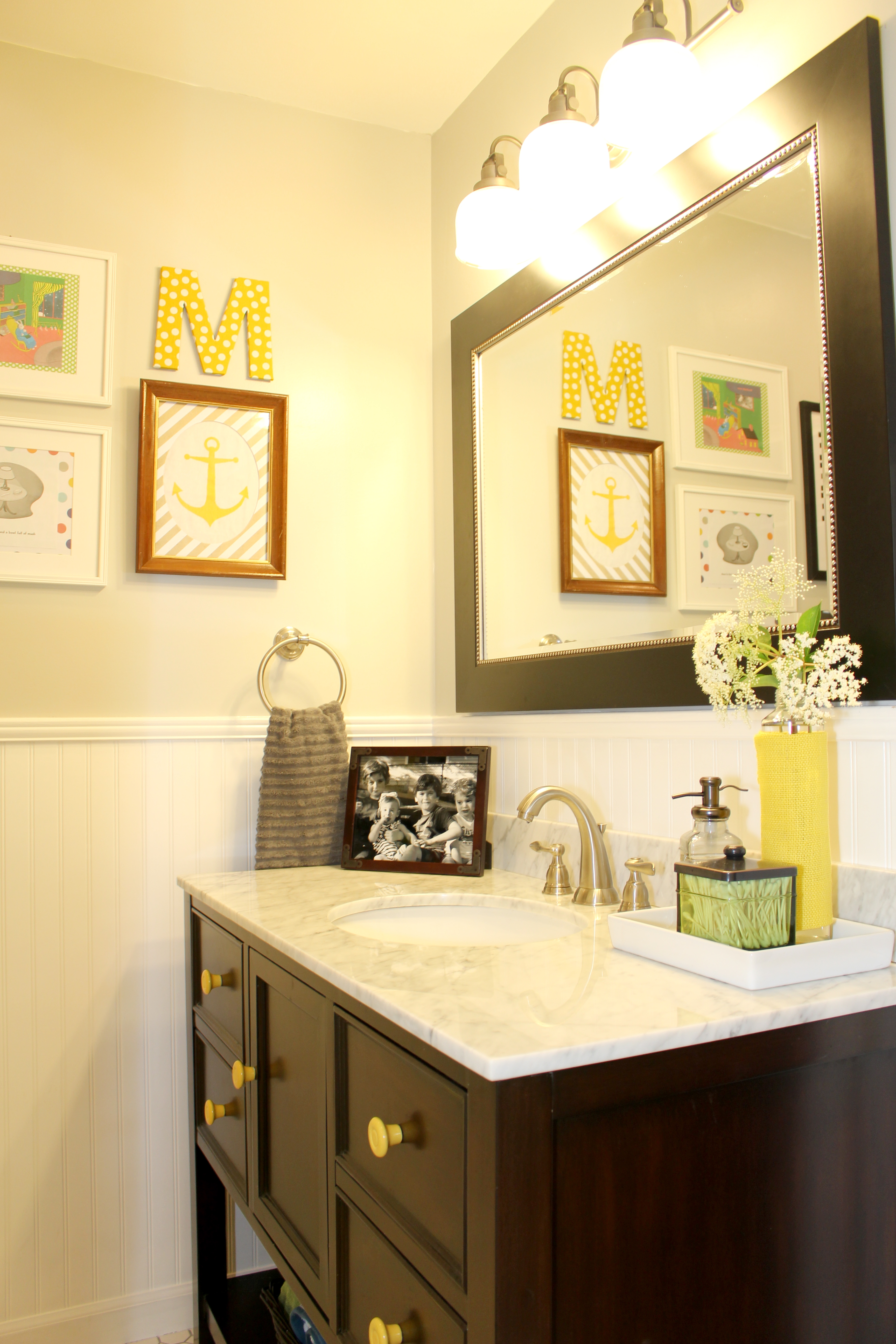 The styling was an absolute blast. An impromptu photo shoot of the family’s four beautiful kiddos provided sustenance for cute frames, purchased from Target and Tuesday Morning. The artwork is a mixture of framed pages from the family’s favorite bedtime story, “Goodnight Moon,” a fun graphic print, and an framed anchor. The anchor is fabric from Hobby Lobby and the mat surrounding it was cut from scrapbook paper from the same store. An estate-sale frame provides the contrast needed to complete the look. Another personal touch comes from the fun, polka fabric-covered initial for the family’s surname. The fun vase on the vanity countertop is a recycled bottle, covered in yellow burlap, mirroring the whimsical knobs on the cabinet doors, another Hobby Lobby find.