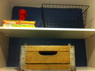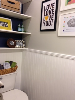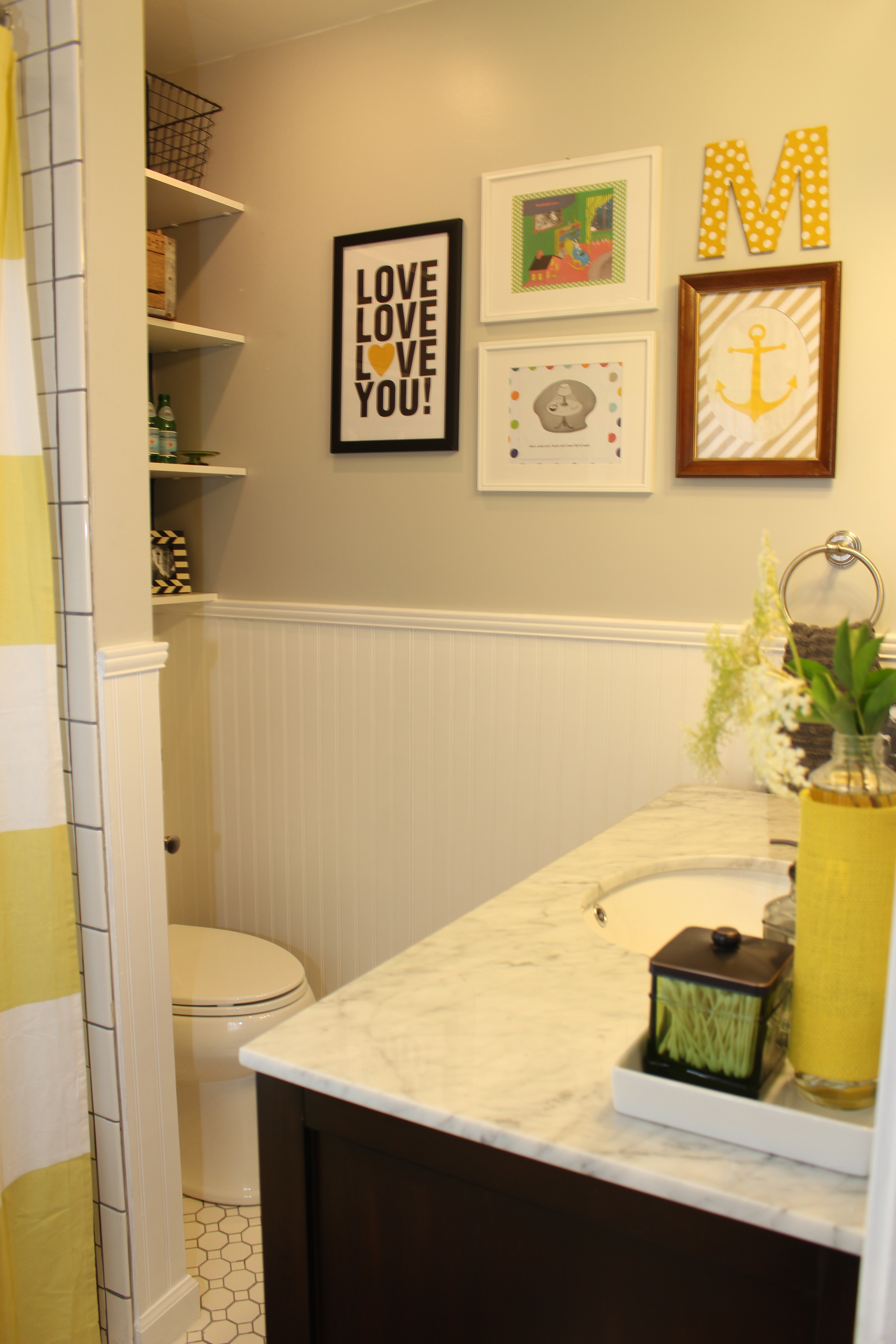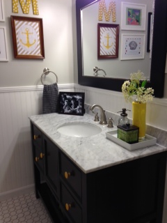 The floral wallpaper and blue fixtures were visually overwhelming and we knew we had a lot of work ahead of us, but were excited to take on the challenge. The first big decision to be made was color scheme. Monochromatic (all whites and grey tones) or contrast (add in some dark wood and color)? Heather readily agreed with our initial suggestions of subway tiles for the shower surround, hexagonal white tiles for the floor, and grey for the wall. The vanity cabinet, however, was not such an easy decision. After nights of pinning ideas, shopping online and in local stores, and wrestling and grappling over choices, we all decided finally on a dark wood, stream-lined, carrera marble-topped piece. Beadboard, a shelving system above the toilet, and lots of primary colors for decorative accents rounded out the decision making to transform this dated bathroom into a classic, yet playful bathroom suited for kids. Here are the fabulous results: