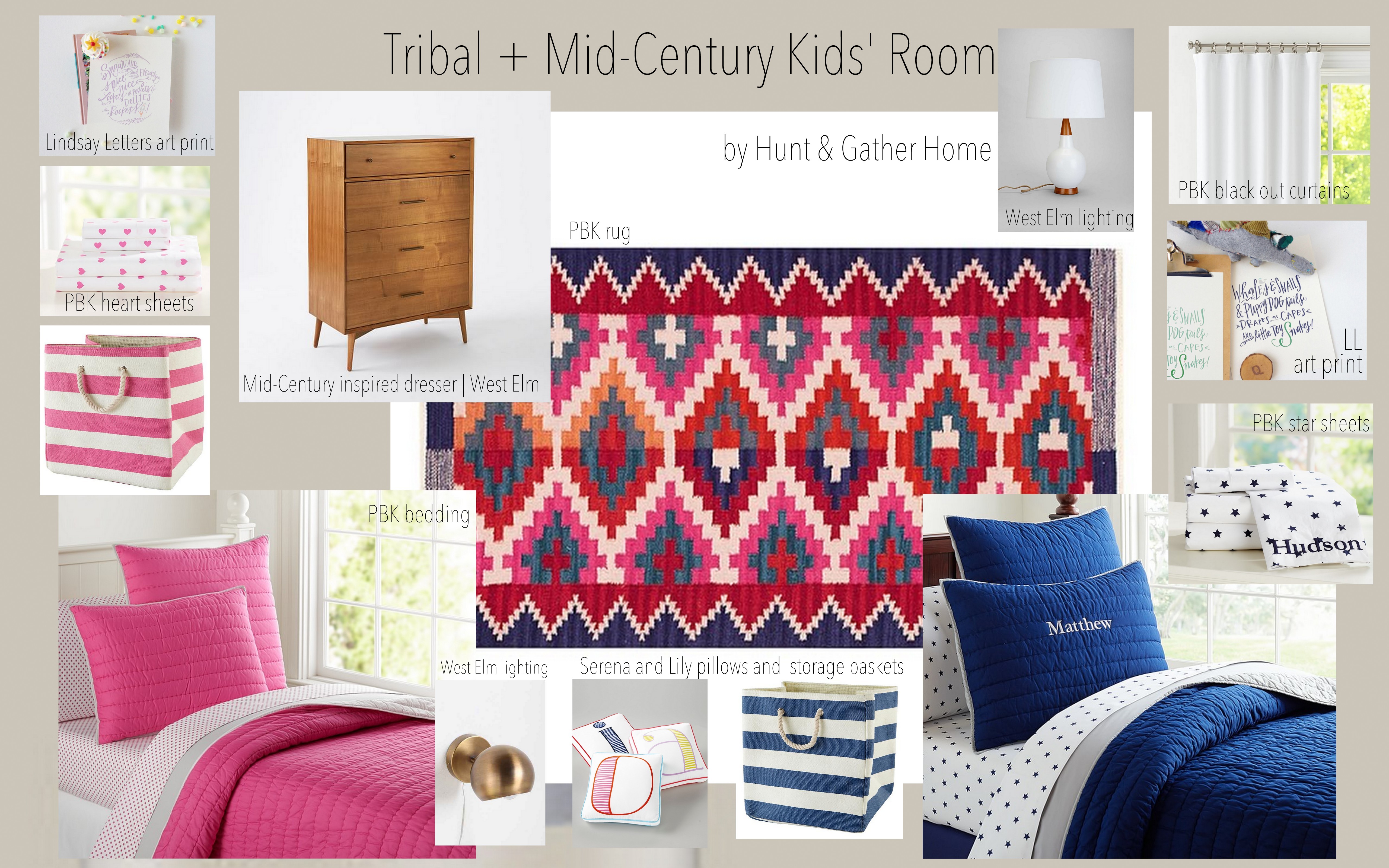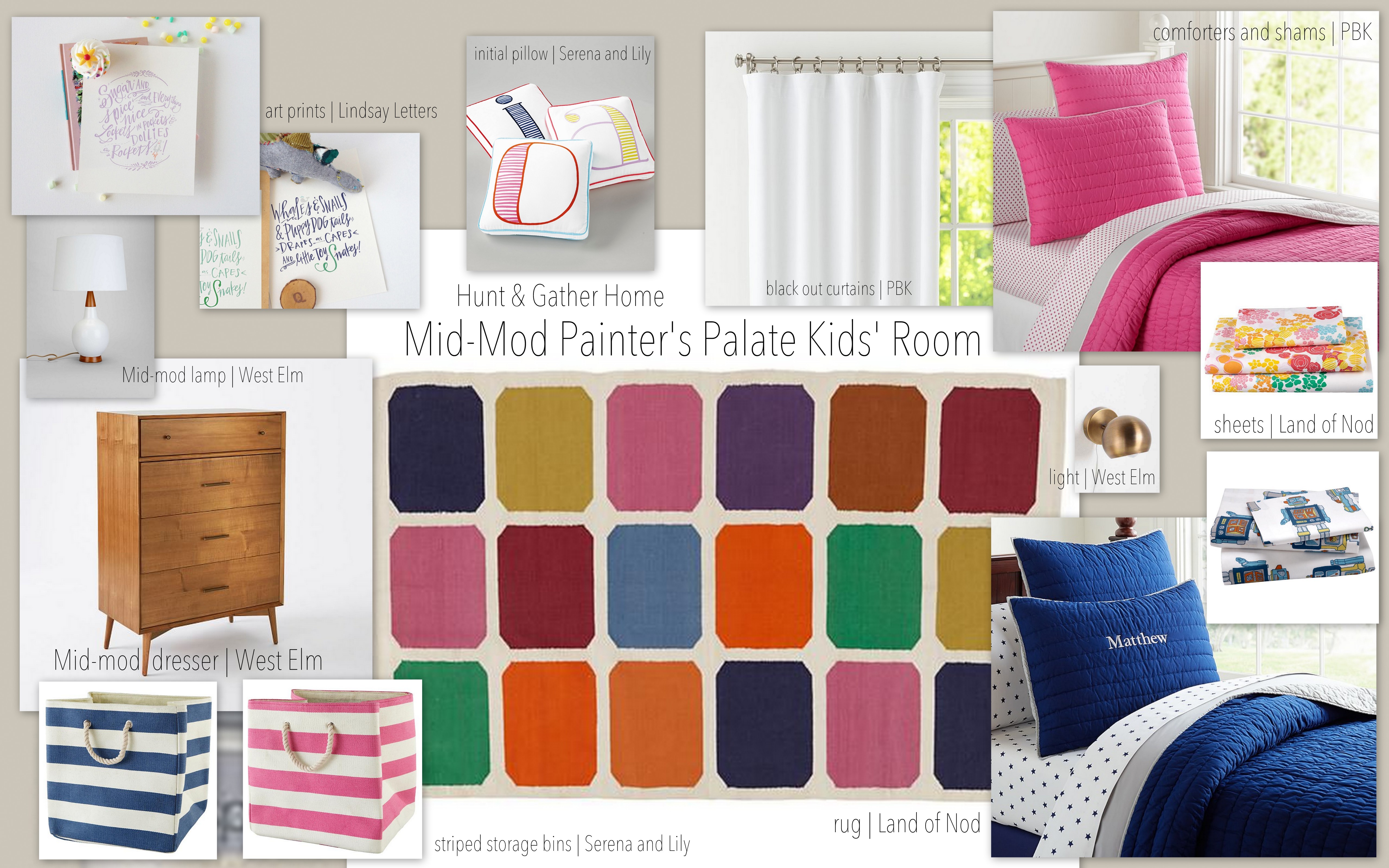 While the freshly painted walls are drying and the family is moving in, we’ve been working on design boards for the kids’ room. Being the wonderful mother she is, Holly wanted to tackle her kids’ room first in order to help them adjust to the move and have a special space all their own. Her two young children, boy and girl ages 4 and 2, will share a bedroom and have a fun playroom where their imaginations can run wild. We decided to tackle the bedroom design first and created a few design boards for inspiration.