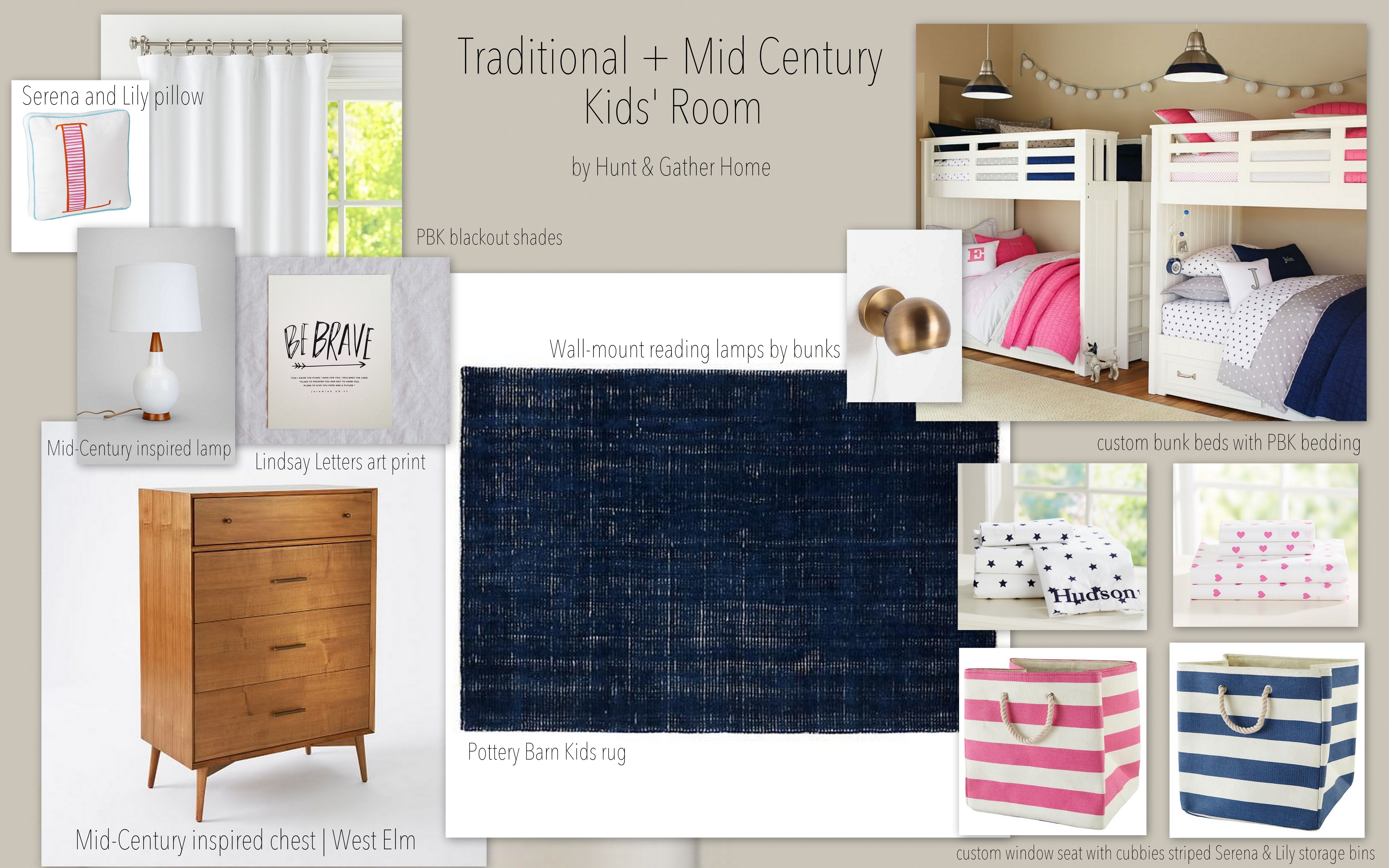 After the rug, we knew the room needed one other stylish yet serviceable piece of furniture: a dresser or chest-of-drawers. Given the size of the wall and the vertical nature of the bunk-beds, we chose a chest-of-drawers. In keeping with the furniture in the rest of the home, we recommended a fun, Mid-Century inspired piece from West Elm, or a similar vintage find. Though only one piece of furniture in this room will actually be Mid-Century in style, when combined with our rug options, it will help create a fun, vintage-modern look in the room. Small Mid-Century accessories like a lamp and reading lights will add to room’s modern mid-century vibe. In this room, a little will go a long way.