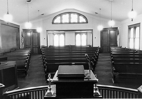 The church was closed on the day I stopped to take photographs, but this photo, courtesy of the National Register nomination, shows the interior of the original 1911 sanctuary. I would love to see the semi-circular railing in person. This photo also shows the original wooden pews.